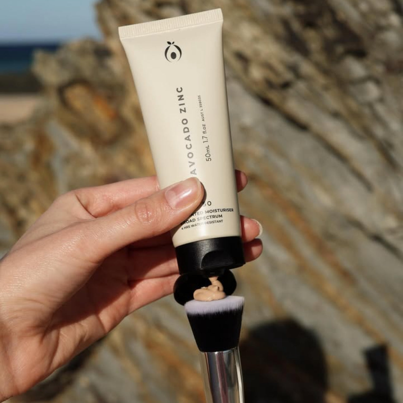 The Avocado Zinc SPF Face Brush is specifically crafted for effortless application of sunscreen and tinted moisturisers, giving you a quick, airbrushed finish without the mess.