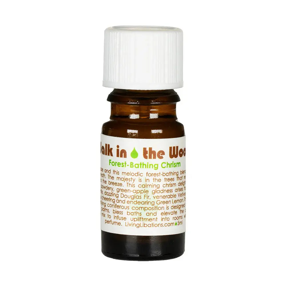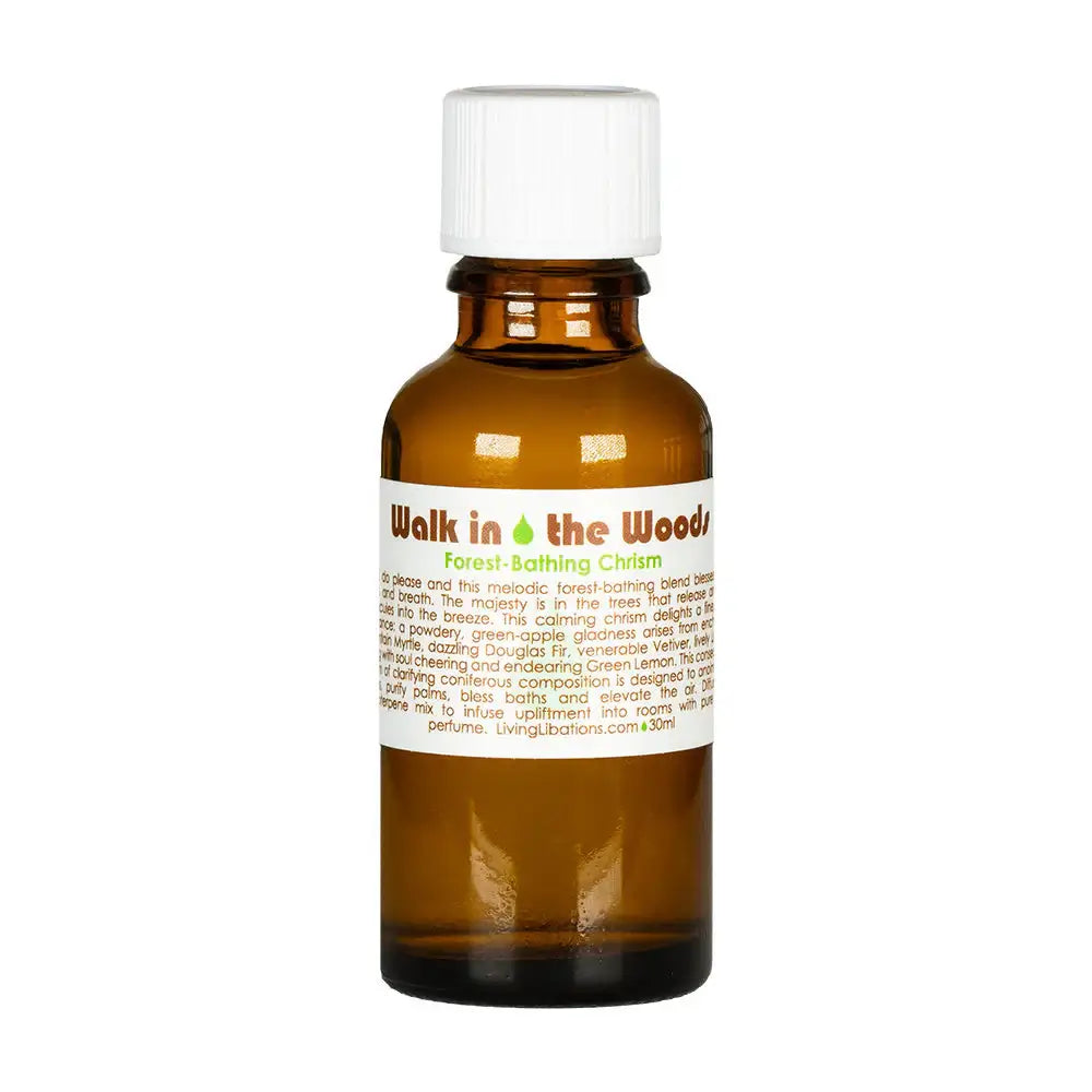 Trees do please, and Living Libations Walk in the Woods Chrism by Living Libations is a majestic forest-bathing blend of aromatic molecules called monoterpenes that trees release in the breeze. We inhale these magical molecules as we walk in the woods, and they are pulsed through the body, promoting deep calm, big breaths, and clarified centering.